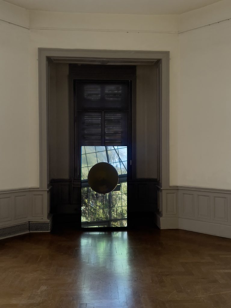 Infinitely following the golden balloon with the camera Heike Baranowsky‘s 45 sec video Eppur si muove makes for great cinema. It is almost like the reversal of an extensive Ballhaus gyroscopic gesture, similar to his camera action during Solomon and Marta‘s meeting in the Roman palazzos‘s courtyard in Fassbinder‘s eponymous movie. In a dizzying motion the camera circles around Margit Carstensen and Karlheinz Böhm, who simultaneously revolve around each other. In Eppur si move – also made in Rome – the movements are crossing over; who or what is moving? The balloon, the artist or the studio? The video turns into a self-reflection on current working and living conditions. The way the artist observes herself in the mirror image of the balloon, orbiting around herself whilst filming in her Roman studio.