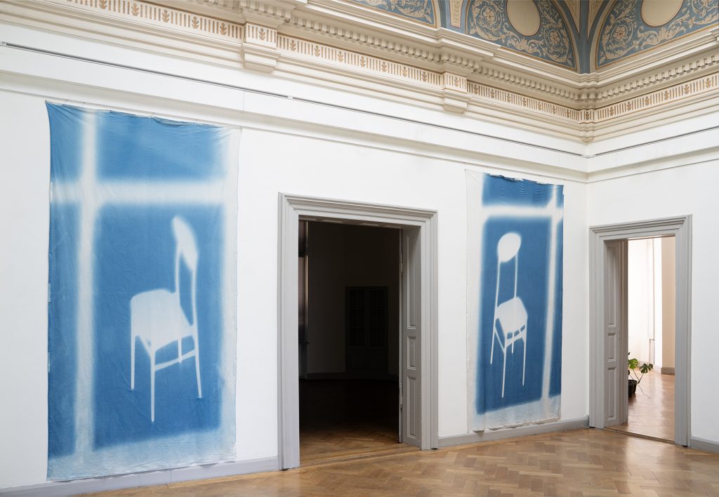 For My Father’s Chair, Baranowsky created in her Berlin studio large-scale cyanotypes of one chair of the first dining room set from her parental home. As if viewed through a window, slanted by the camera angle, the viewer looks down at the empty, distinctive chair from the 1960s. What type of wood might it be carved from? However, the camera perspective as suggested by the crossbars of the window frame is an illusion; the cyanotype is created solely by the incoming light and the shadow it casts.